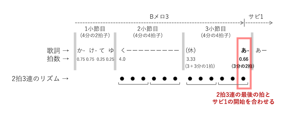 サビ1の最初の音は、2拍3連の最後(12回目)の拍(最後の3分の2拍)と一致しているので、ベースやドラムのリズムをしっかり聞けば、タイミングを合わせる事ができます。
