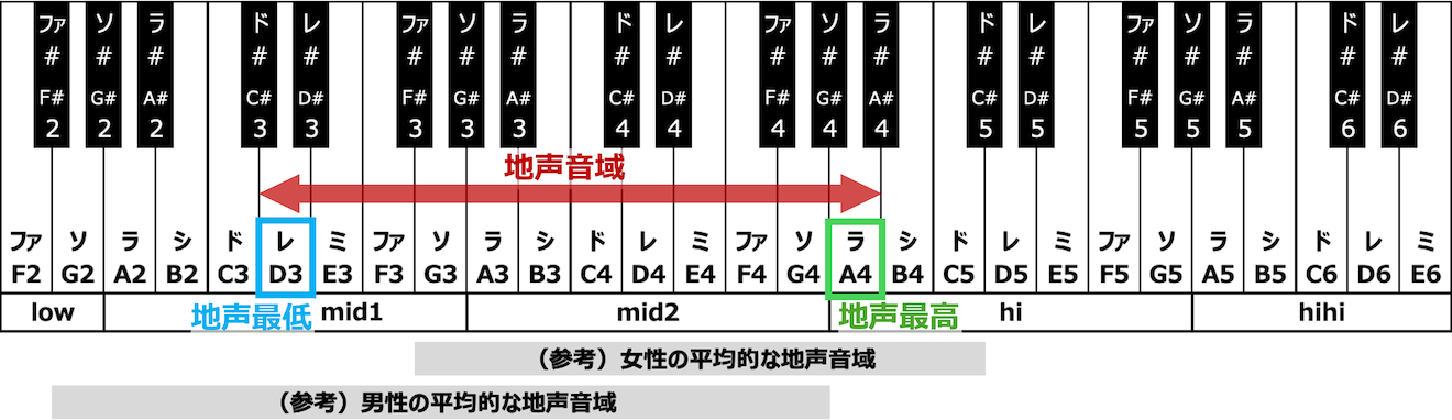 このとき、地声最高音はC5(hiC、ド)になるので、平均的な女性の地声最高音に一致し、高音側も無理なく歌える高さになります。