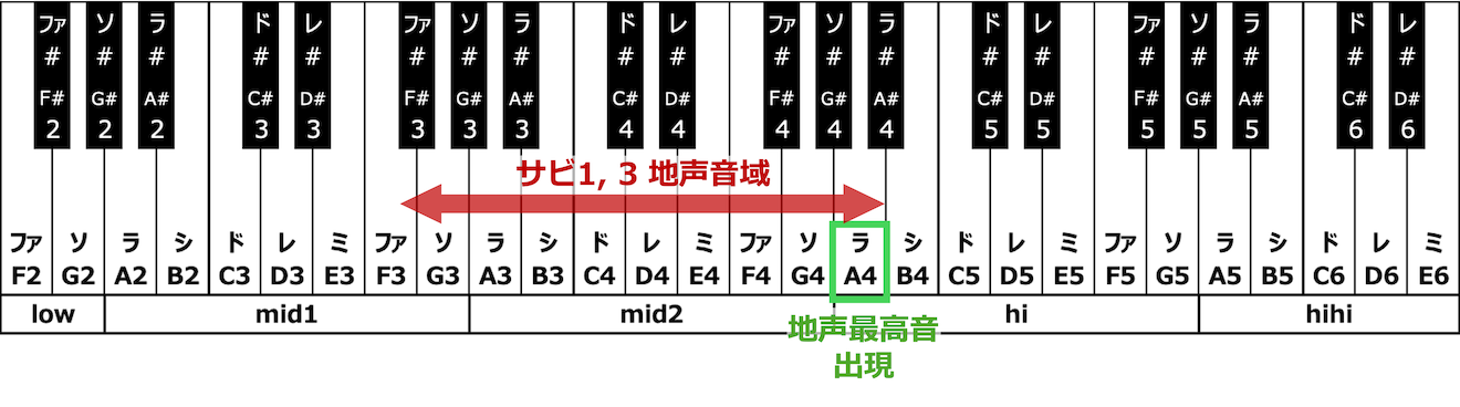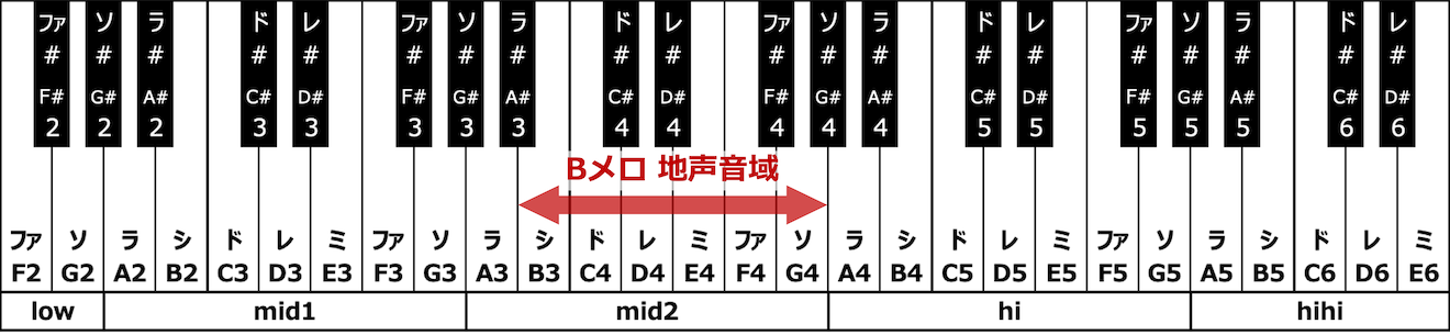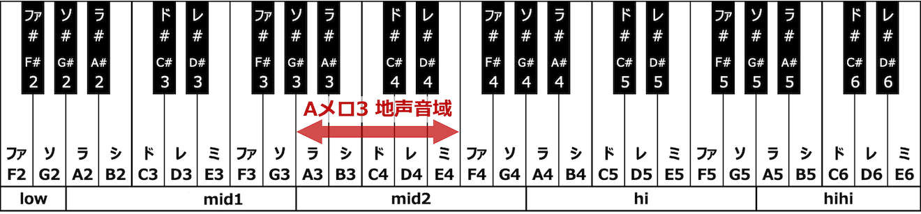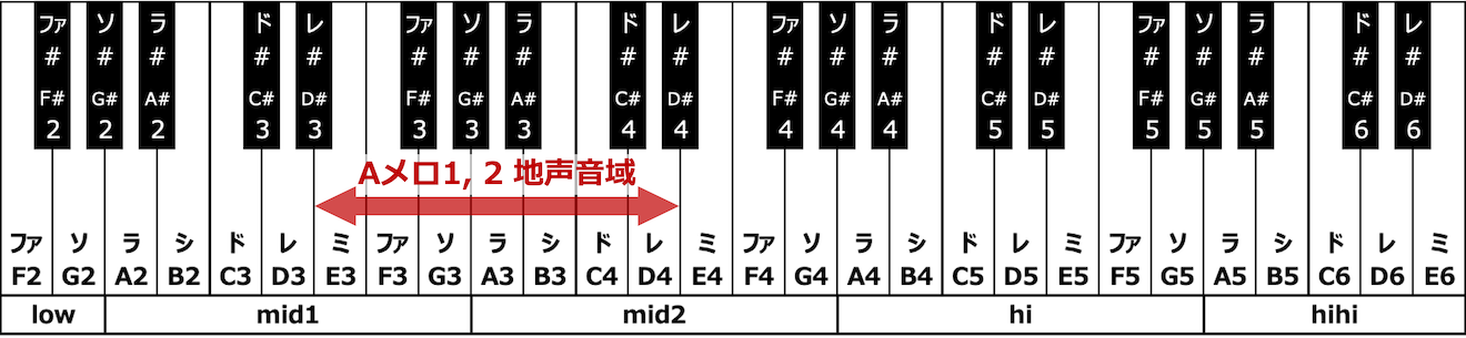 そこで、本楽曲で2番目に低い地声最低音はE3(mid1E、ミ)であり、これは曲中に何度も出現する事を踏まえると、この音を確実に発声できるよう、