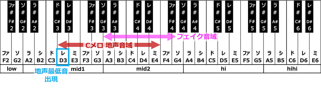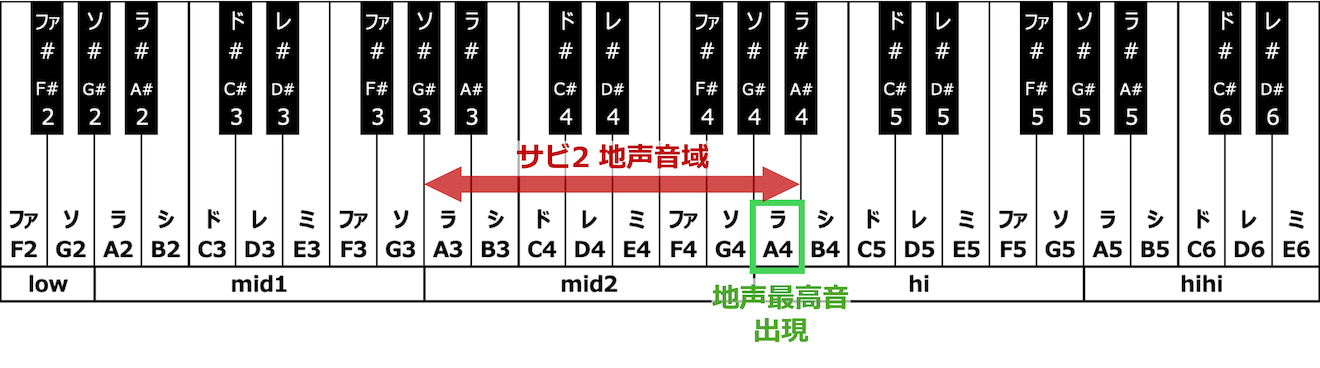 しかし、本楽曲では、地声最低音のD3(mid1D、レ)は、全体を通じて1回しか出現しません。