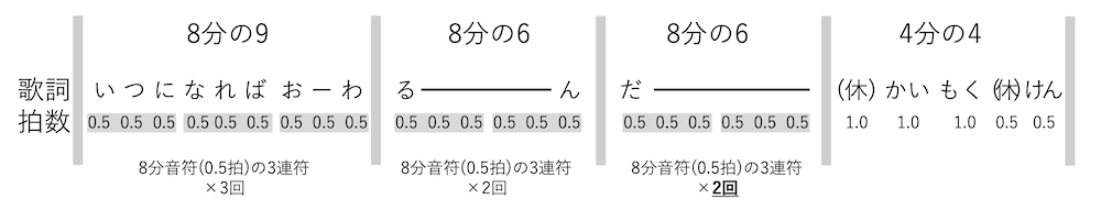 対処法としては、下記フレーズは、8分の9拍子と8分の6拍子で構成されているのですが、この間は3連符(8分音符×3)でリズムを取り続け、最後の「だー」で3連符を2セット刻み終わったら、今度は4拍子1泊分を休んでかいもく・・」と入ると、ピッタリ合わせられます。