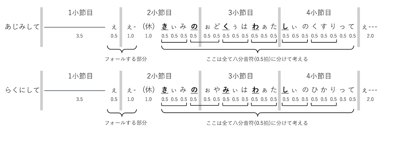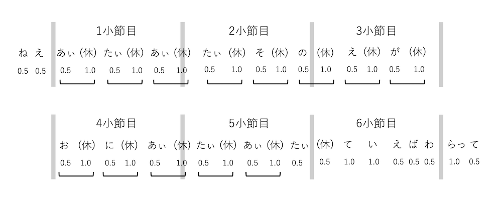 のように、子音と母音を分け、全て八分音符(0.5拍)に分解して考えると、把握しやすかったです。